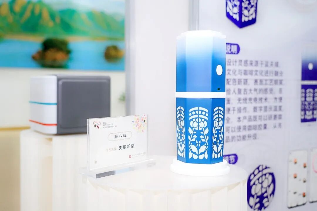 作品《“夹缬新韵”智能咖啡机》,与温州的传统手工艺蓝夹缬工艺进行融合,又结合了柱形灯笼的外观,让设计既体现温州传统文化特色,又符合现代时尚生活。同样的蓝夹缬工艺在另一个作品《瓯纹》中则呈现了完全不同的风采——现代化的制鞋技术与传统手工艺相结合,充分展现了温州深厚的制鞋产业渊源,同时又让非遗文化与时尚穿搭融合出与众不同的设计特色。《福兔贺春》则将台湾的传统灯会项目与中国红、十二生肖等元素相融合,打造出两个生动可爱的中国生肖兔造型,表达了“两岸一家亲,佳节盼团圆”的美好寓意。