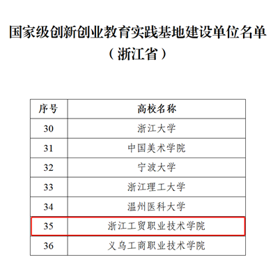 温都讯 近日,教育部办公厅发布《关于公布国家级创新创业学院、国家级创新创业教育实践基地建设单位名单的通知》,浙江工贸职业技术学院(以下简称“浙工贸”)榜上有名,成功入选国家级创新创业教育实践基地建设单位,这也是该校近年来创新创业教育改革取得的又一重大标志性成果。
