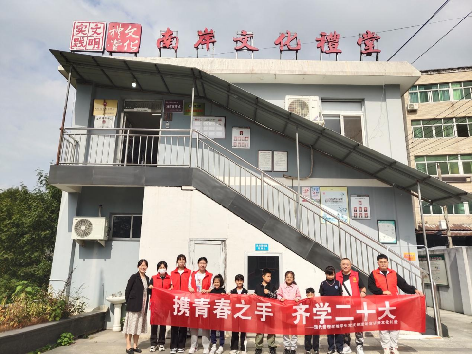 连日来,浙江工贸职业技术学院现代管理学院党总支组织学生党员和入党积极分子来到藤桥镇南岸村文化礼堂“大手”拉“小手”、“青年”带“少年”,向少先队员宣讲党的二十大精神,用少年儿童听得懂、记得住的语言,培养少年儿童对党和国家的情感认同,鼓励的少先队员通过努力加入共青团,加入中国共产党,为实现中华民族伟大复兴而奋发图强。
