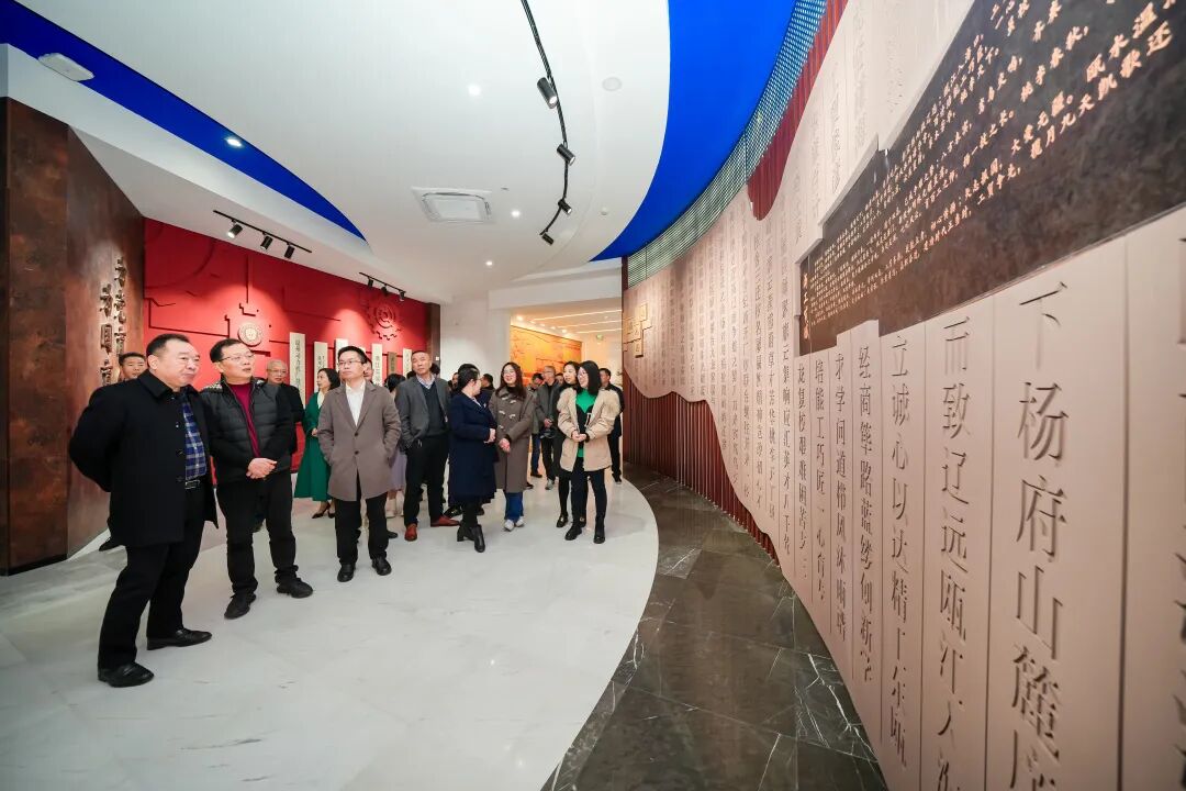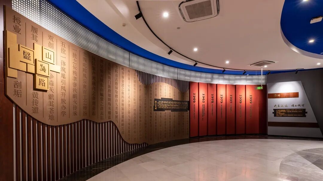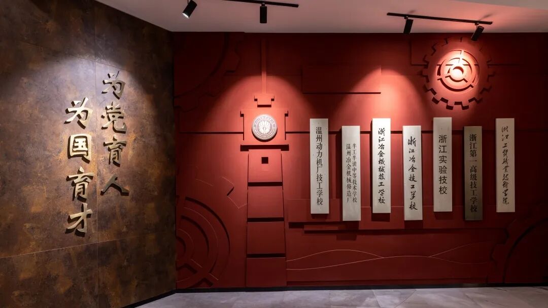 “校舍三迁,校名屡易,然精神岂改,初心不息.......”,序厅中的“工贸赋”采用木活字印刷的理念,记录着该校“七易三迁屡突破”的光辉历程。工贸赋中曲线为瓯江入海口造型,寓意学校扎根温州,踏浪而起,借海扬帆。