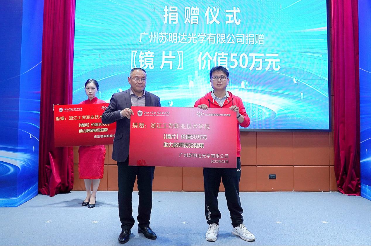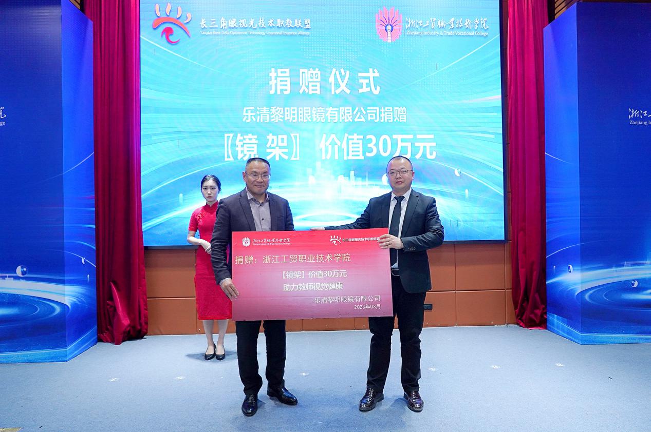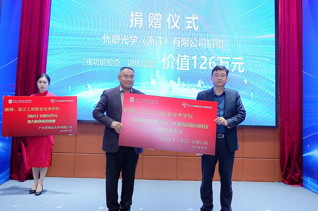 成立仪式上,乐清黎明眼镜有限公司、广州苏明达光学有限公司、优眼光学(浙江)有限公司为眼镜产业发展捐赠了镜片、镜架、功能训练仪、检查仪等设备,助力教师视觉发展,推动眼视光实训教学。