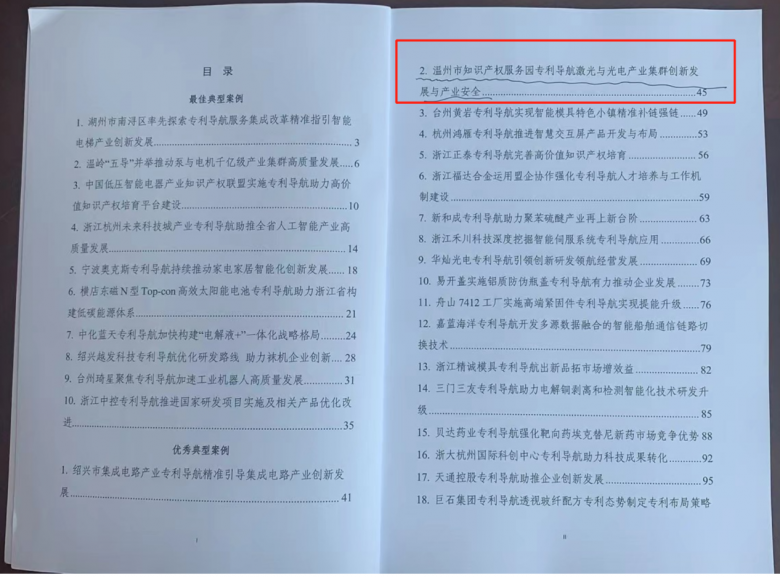 另外,推进会上还发布了全省20个优秀典型案例,温州市知识产权服务园的一项激光与光电产业集群专利导航成果成功入选优秀典型案例,充分展示了专利导航在推动创新发展、促进产业升级、提高企业竞争力等方面的作用。