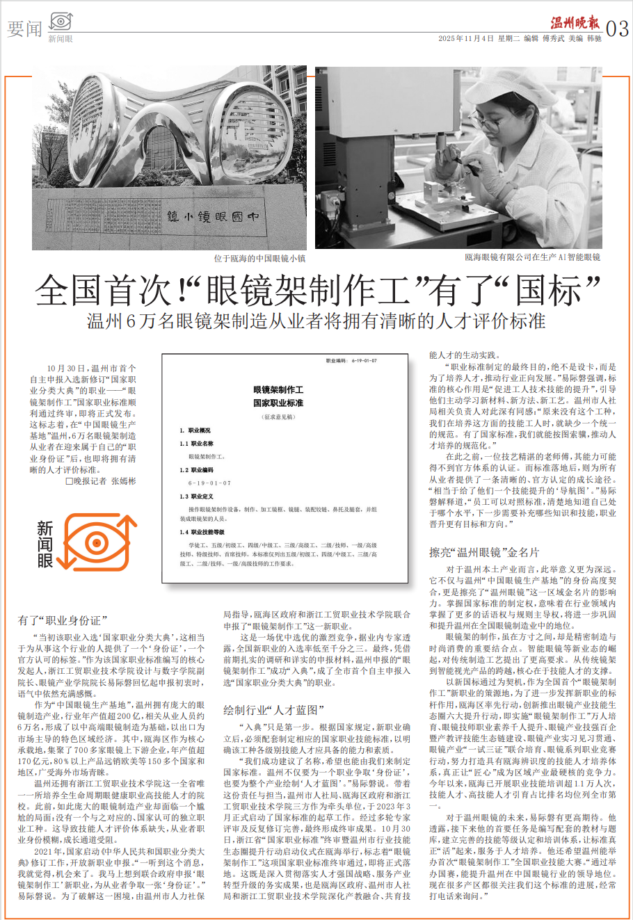 温州晚报:全国首次!眼镜架制作工”有了“国标