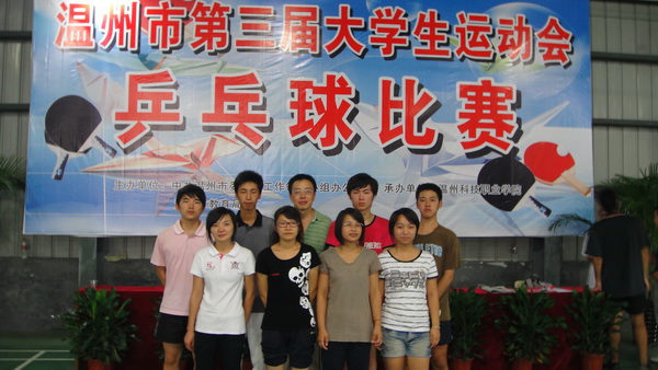 温州市教育局主办的温州市第三届大学生运动会乒乓球赛于2010年9月24日-26日在温州科技职业学院举行。我院乒乓球队获得总分第三名,男子团体第二、女子团体第三。郑哲豪、张呈分别获得男子单打第三名、第七名,邵君获得女子单打第六名。郑哲豪/张呈获得男子双打第二名。陆冯/邵君、韩璐莎/尉鲁湾分别获得女子双打第三名、第五名的好成绩。特此喜报!