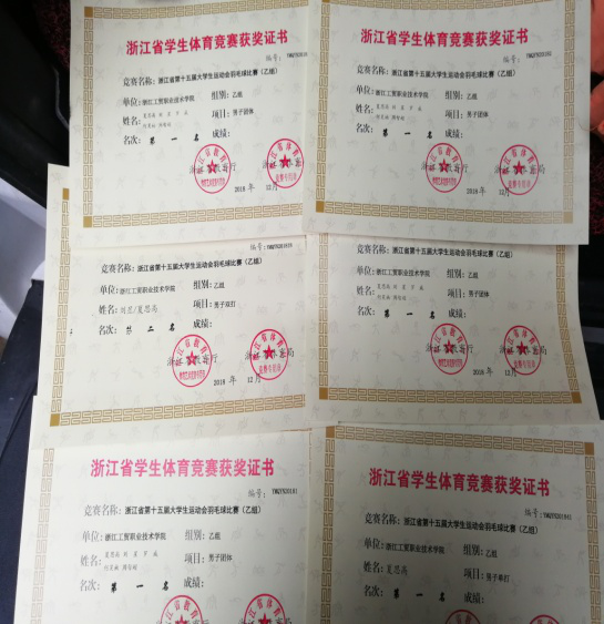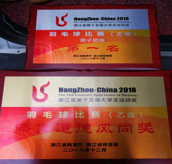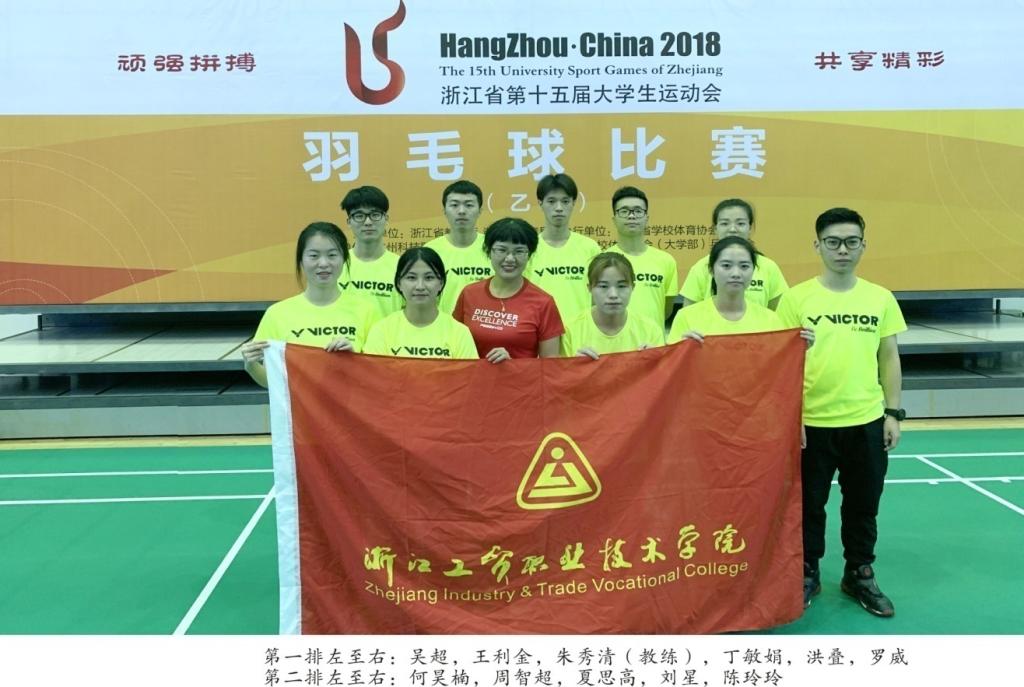 由省教育厅、省体育局主办的第十五届大学生运动会羽毛球比赛于2018年12月4日至7日在杭州科技职业技术学院举行。据统计,参加此次羽毛球赛事的学校与运动员人数为历年之最。经过四天的激烈对战,我院羽毛球队在体育中心朱秀清老师的带领下,凭借精湛技术和巧妙排兵,最终获得男子团体第一名、男子单打第一名、男子双打第二名和团体总分第三名的优异成绩,同时,朱秀清老师获得优秀教练员称号,学院获得体育道德风尚奖。