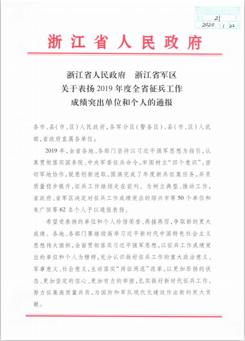 日前,浙江省人民政府、浙江省军区联合发文对2019年度全省征兵工作进行通报表扬,我院荣获“2019年度浙江省征兵工作成绩突出单位”荣誉称号,这是继2016年度后,我院再次获得此殊荣。在此次通报中,全省共19所高校获此荣誉。