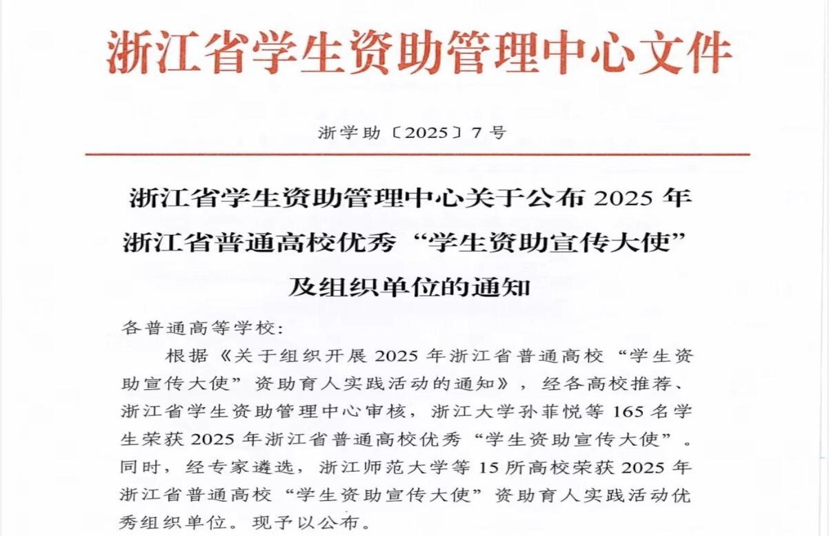 喜报:我校两名同学荣获2025年浙江省优秀“学生资助宣传大使”称号